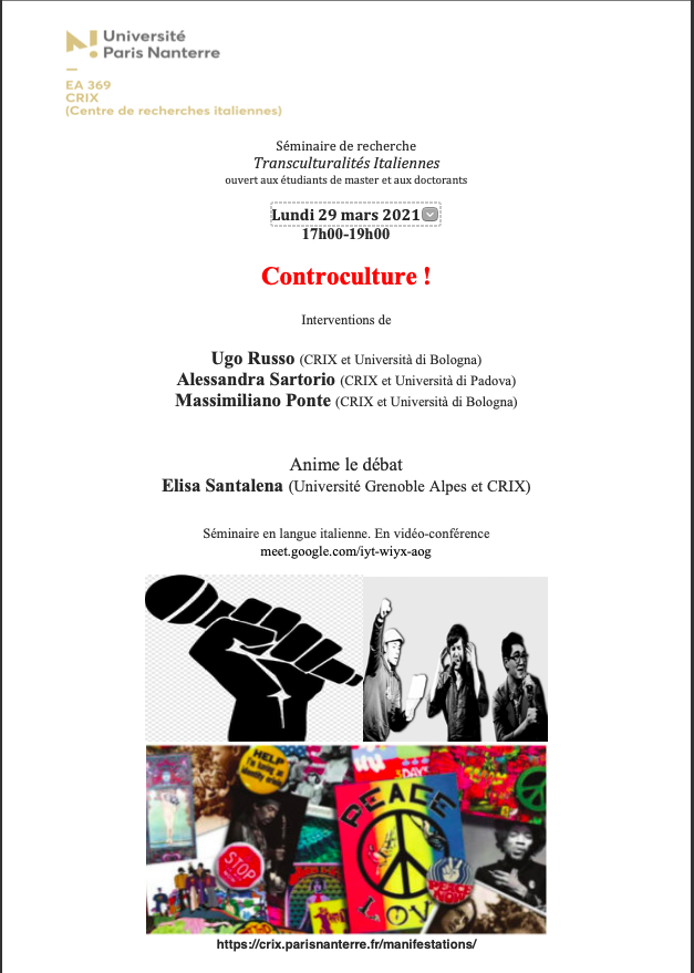 Dans le cadre du séminaire «Transculturalités italiennes», coordonné par Silvia Contarini et Christophe Mileschi, directeurs du CRIX (Centre de Recherches Italiennes). Le lundi 29 mars à 17h00, séminaire Master et Doctorat consacré à : «Controculture !»