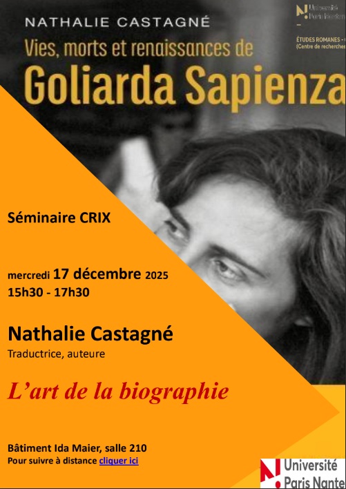 Nathalie Castagné, traductrice de l’œuvre complète de Goliarda Sapienza et auteure de «Vies, morts et renaissances de Goliarda Sapienza» (Seuil) est l'invitée de ce séminaire sur l'art de la biographie.