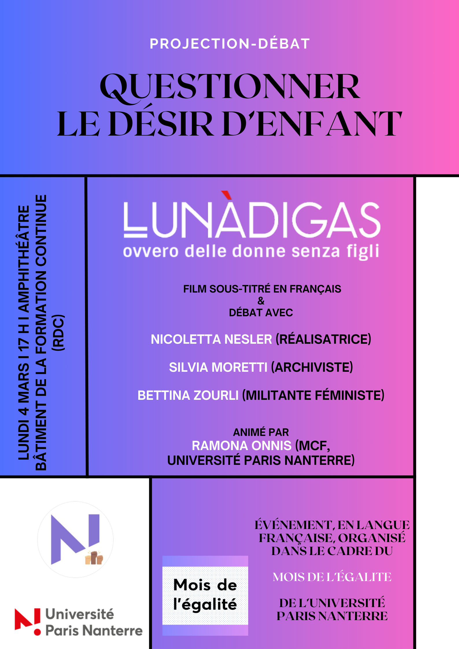 Dans le cadre du Mois de l'Egalité, organisé par la Mission Egalité de l'Université Paris Nanterre, nous aurons le plaisir de visionner le long-métrage documentaire Lunàdigas (italien, sous-titré français) de Nicoletta Nesler et Marilisa Piga (Italie 2016, 77 minutes).